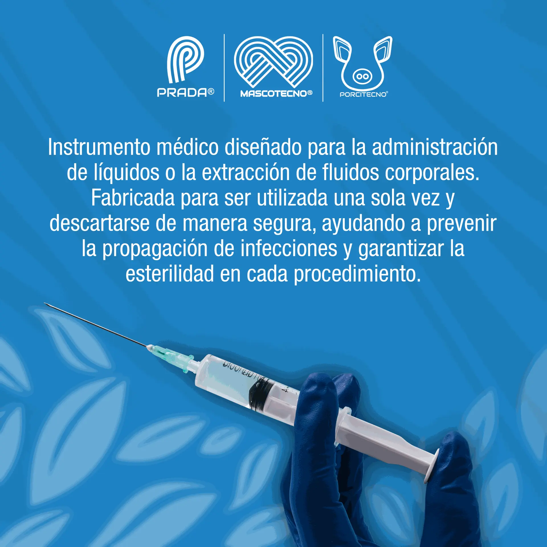 Jeringas desechables para introducir y/o extraer líquido, medicamentos y fluidos, de tres partes en polipropileno y agujas en acero inoxidable.