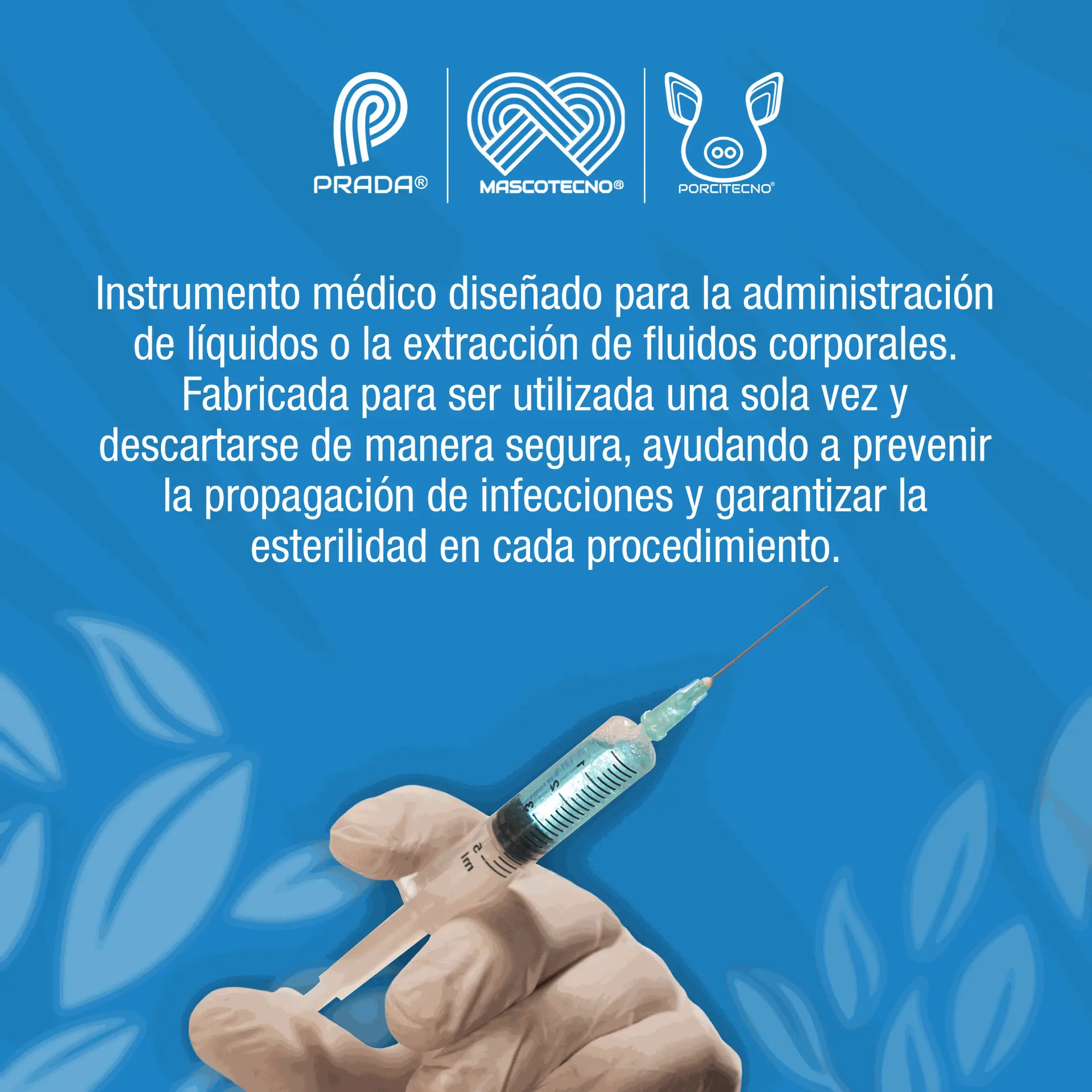 Jeringas desechables para introducir y/o extraer líquido, medicamentos y fluidos, de tres partes en polipropileno y agujas en acero inoxidable.