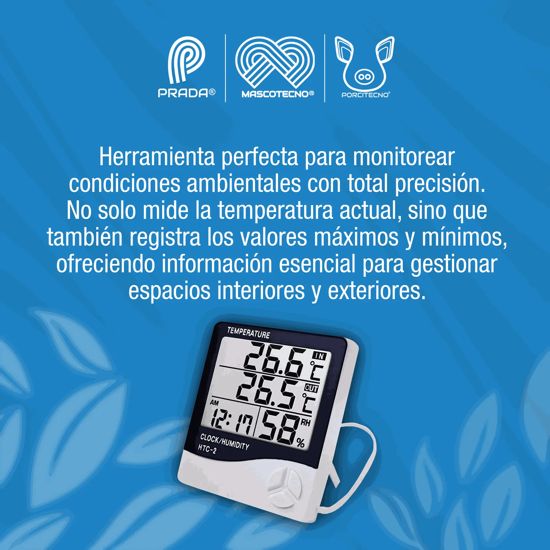 Descubre la herramienta perfecta para monitorear condiciones ambientales con total precisión. Nuestro termo-higrómetro no solo mide la temperatura actual, sino que también registra los valores máximos y mínimos, ofreciendo información esencial para gestionar espacios interiores y exteriores. Con un diseño compacto y fácil de usar, este dispositivo combina funcionalidad y tecnología avanzada, ideal para porcicolas, avicolas y en general cualquier area de veterinaria que necesite monitorear. Optimiza tu entorno y toma el control del confort y la humedad con un solo vistazo.Es un termómetro, higrómetro, reloj y calendario digital todo en uno, el cual tiene una pantalla LCD de gran carácter con bajo consumo de energía. En el dispositivo se puede visualizar la temperatura, la humedad, la hora y la fecha de forma simultánea. Es un dispositivo estable con alta precisión que se puede colocar sobre la mesa o colgar en la pared según las necesidades de la persona.