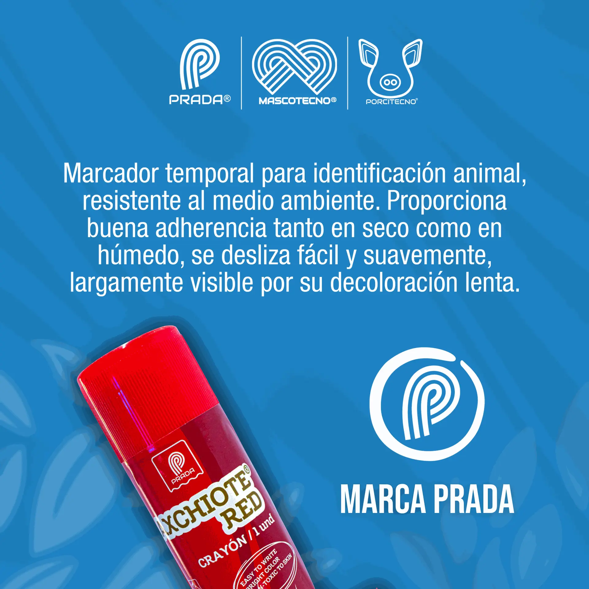 Es un marcador temporal para identificación animal, resistente al medio ambiente. Proporciona buena adherencia tanto en seco como en húmedo, se desliza fácil y suavemente, largamente visible por su decoloración lenta, resistente a la intemperie y CRAYON apto para todo tipo de animal. Producto libre de elementos tóxicos. Lapiz marcador tipo raidex